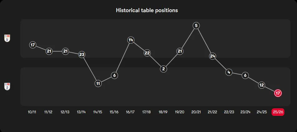 The constant decline follows, Clarke was sacked in March 2025 before the seasons end. Hourihane replaced him as interim, then after rumours he would join MK Dons as Paul Warne‘s assistant, the board opted to make the appointment permenant.