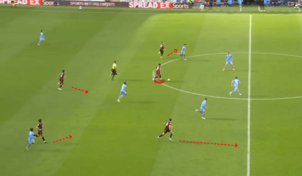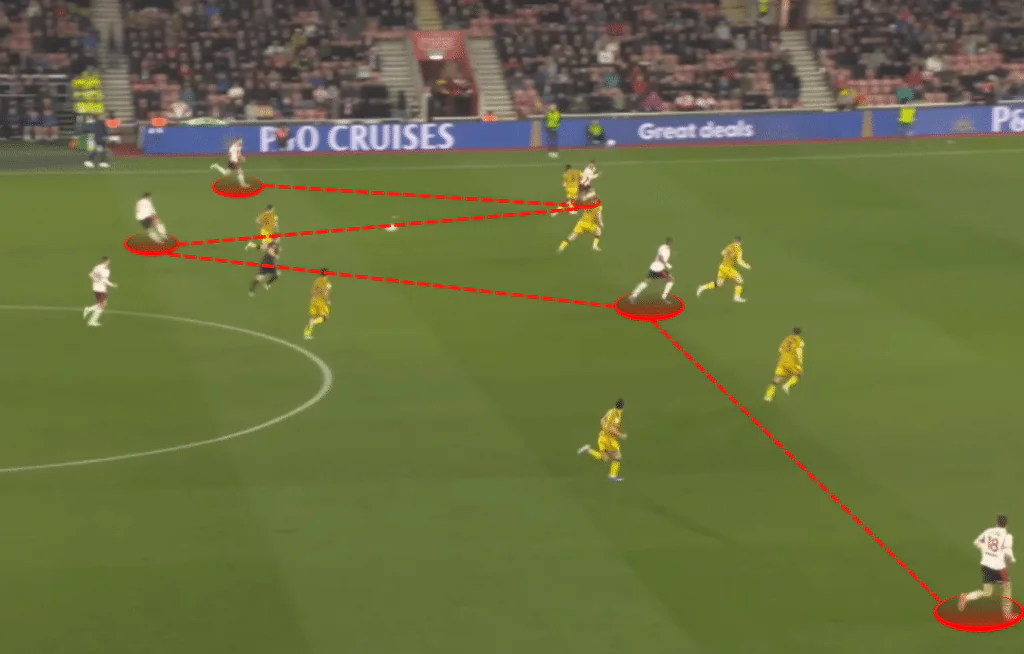 Against these systems, designed to defend first, then launch counter-attacks through the flanks, Saints have pushed Ryan Manning high and wide in possession, forming a front five. This pins the opposition’s wing-backs into their own half, preventing them from becoming outlets on the counter-attack.