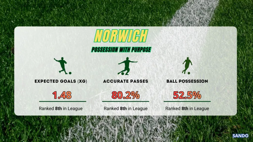 Norwich leads in Expected Goals (1.48 xG vs 1.19 xG) and average shots per game (12.2 vs 11.7).